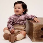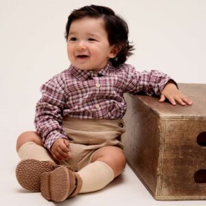 Camisa bebé manga larga a cuadros en tonos burdeo y gris con botones de madera en la parte delantera y en las mangas, esta camisa es de la prestigiosa marca https://dadati.es/
