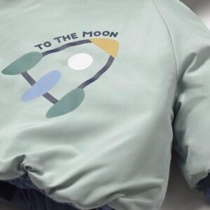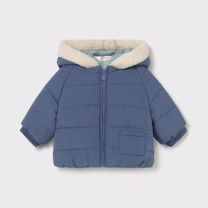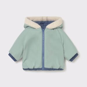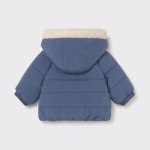 Chaqueta de manga larga para recién nacido. Capucha con detalles de pelo. Cierre central delantero con cremallera. Exterior textil con efecto acolchado. Suave forro interior de poliéster. Elementos de adorno: serigrafía (print). Este modelo presenta un diseño reversible