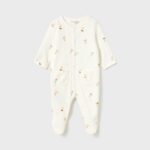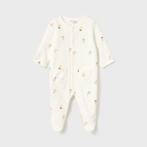 Pijama de manga larga para recién nacido. Cuello redondo. Cierre con botones a presión en la parte delantera. Botones a presión en la entrepierna para facilitar la puesta de la prenda. Diseño estampado.